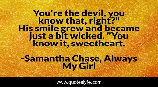 This page presents the quote "You're the devil, you know that, right?" His smile grew and became just a bit wicked. "You know it, sweetheart.". Author of this quote is Samantha Chase, Always My Girl. This quote is about friends-to-lovers, contemporary-romance,.