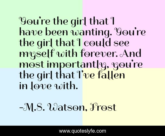 This page presents the quote "You’re the girl that I have been wanting. You’re the girl that I could see myself with forever. And most importantly, you’re the girl that I’ve fallen in love with.". Author of this quote is M.S. Watson, Frost. This quote is about love, romance, greek, teaser, characters, mythology, affection,.