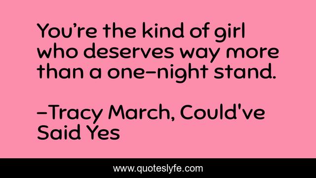 This page presents the quote "You’re the kind of girl who deserves way more than a one-night stand.". Author of this quote is Tracy March, Could've Said Yes. This quote is about biker-romance, contemporary-romance,.