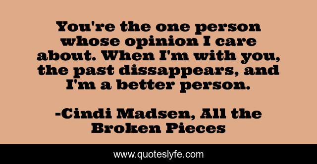 This page presents the quote "You're the one person whose opinion I care about. When I'm with you, the past dissappears, and I'm a better person.". Author of this quote is Cindi Madsen, All the Broken Pieces. This quote is about opinion, better-person, present,.