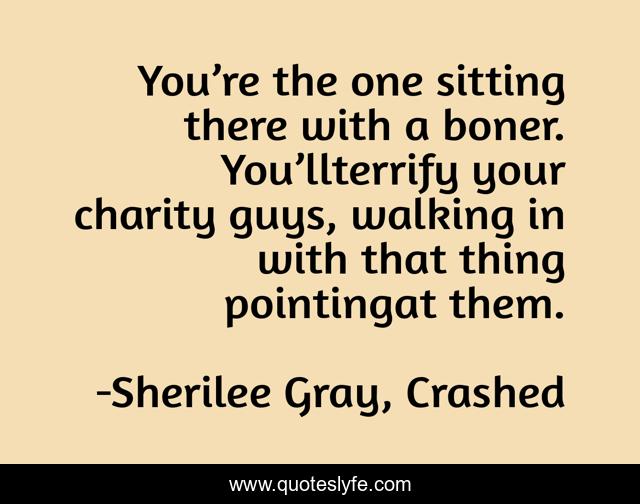 This page presents the quote "You’re the one sitting there with a boner. You’llterrify your charity guys, walking in with that thing pointingat them.". Author of this quote is Sherilee Gray, Crashed. This quote is about contemporary-romance, dirty-talk,.