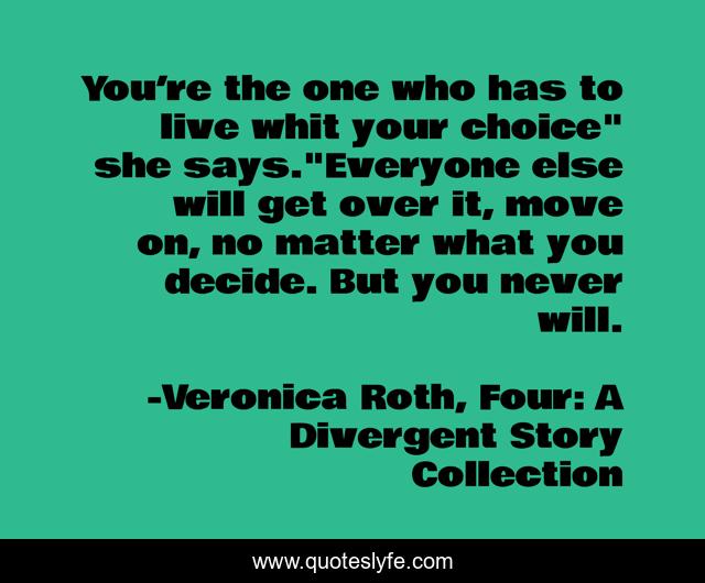 This page presents the quote "You’re the one who has to live whit your choice" she says."Everyone else will get over it, move on, no matter what you decide. But you never will.". Author of this quote is Veronica Roth, Four: A Divergent Story Collection. This quote is about tari, destiny, choice, four, future, choices, veronica-roth,.
