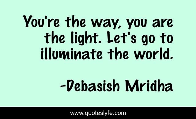 This page presents the quote "You're the way, you are the light. Let's go to illuminate the world.". Author of this quote is Debasish Mridha. This quote is about life, love, knowledge, inspirational, intelligence, philosophy, wisdom, quotes, affection,.