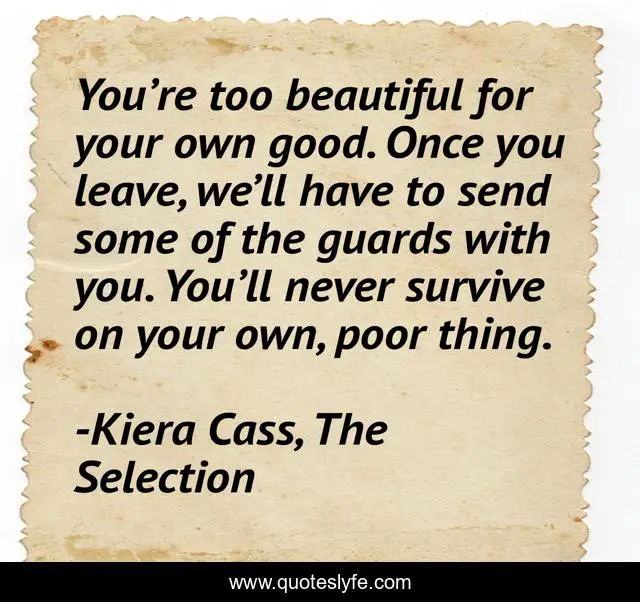 This page presents the quote "You’re too beautiful for your own good. Once you leave, we’ll have to send some of the guards with you. You’ll never survive on your own, poor thing.". Author of this quote is Kiera Cass, The Selection. This quote is about maxon, america,.