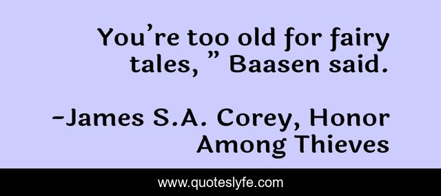This page presents the quote "You’re too old for fairy tales, ” Baasen said.". Author of this quote is James S.A. Corey, Honor Among Thieves. .