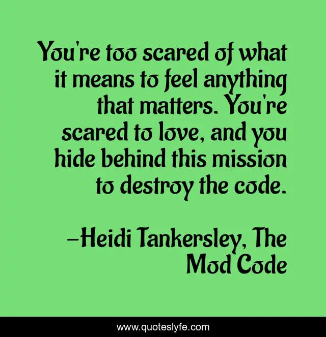 This page presents the quote "You're too scared of what it means to feel anything that matters. You're scared to love, and you hide behind this mission to destroy the code.". Author of this quote is Heidi Tankersley, The Mod Code. This quote is about love, science-fiction-romance, science-fiction-young-adult, romance, pain, affection,.