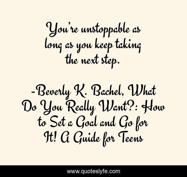This page presents the quote "You’re unstoppable as long as you keep taking the next step.". Author of this quote is Beverly K. Bachel, What Do You Really Want?: How to Set a Goal and Go for It! A Guide for Teens. This quote is about teenagers-and-parents, teenagers, parenting, parenting-teens, nonfiction, inspirational, enthusiasm, nonfiction-self-help, young-adult,.