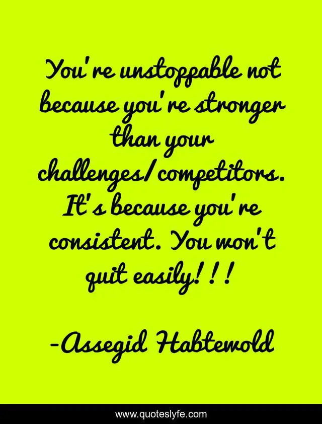 This page presents the quote "You're unstoppable not because you're stronger than your challenges/competitors. It's because you're consistent. You won’t quit easily!!!". Author of this quote is Assegid Habtewold. This quote is about challenges, unstoppable, won-t-quit,.