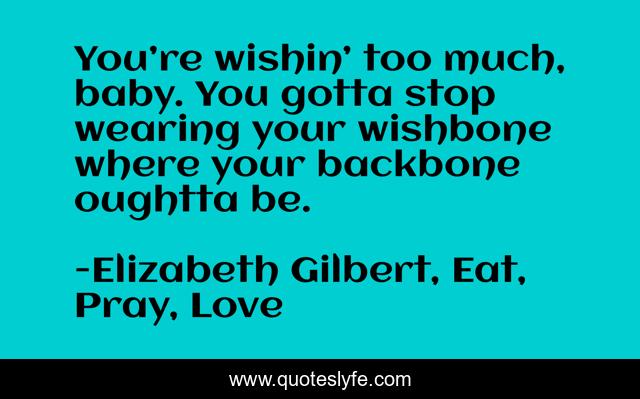This page presents the quote "You’re wishin’ too much, baby. You gotta stop wearing your wishbone where your backbone oughtta be.". Author of this quote is Elizabeth Gilbert, Eat, Pray, Love. .