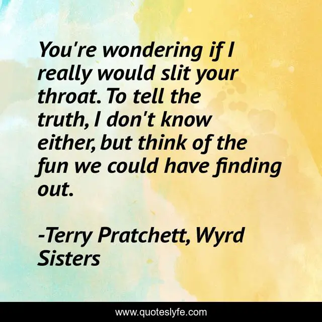 This page presents the quote "You're wondering if I really would slit your throat. To tell the truth, I don't know either, but think of the fun we could have finding out.". Author of this quote is Terry Pratchett, Wyrd Sisters. This quote is about fun, magrat, knife,.