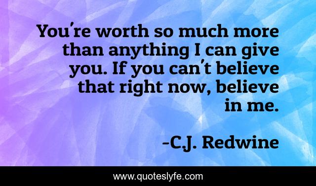 This page presents the quote "You're worth so much more than anything I can give you. If you can't believe that right now, believe in me.". Author of this quote is C.J. Redwine. This quote is about faith, love, belief, affection,.
