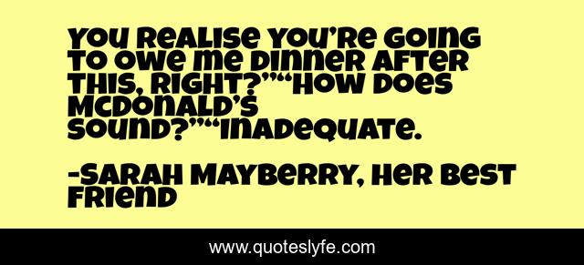 This page presents the quote "You realise you’re going to owe me dinner after this, right?”“How does McDonald’s sound?”“Inadequate.". Author of this quote is Sarah Mayberry, Her Best Friend. This quote is about romance, funny, comedy, humour,.