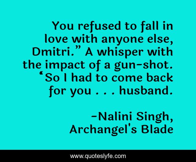 This page presents the quote "You refused to fall in love with anyone else, Dmitri.” A whisper with the impact of a gun-shot. “So I had to come back for you . . . husband.". Author of this quote is Nalini Singh, Archangel's Blade. This quote is about dmitri, honor,.