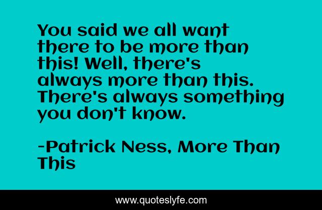This page presents the quote "You said we all want there to be more than this! Well, there's always more than this. There's always something you don't know.". Author of this quote is Patrick Ness, More Than This. This quote is about existence, life,.