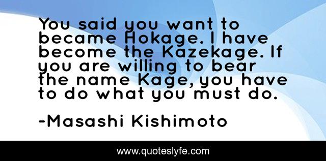 This page presents the quote "You said you want to became Hokage. I have become the Kazekage. If you are willing to bear the name Kage, you have to do what you must do.". Author of this quote is Masashi Kishimoto. This quote is about naruto, life, growing-up, manga,.