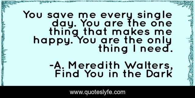 This page presents the quote "You save me every single day. You are the one thing that makes me happy. You are the only thing I need.". Author of this quote is A. Meredith Walters, Find You in the Dark. .