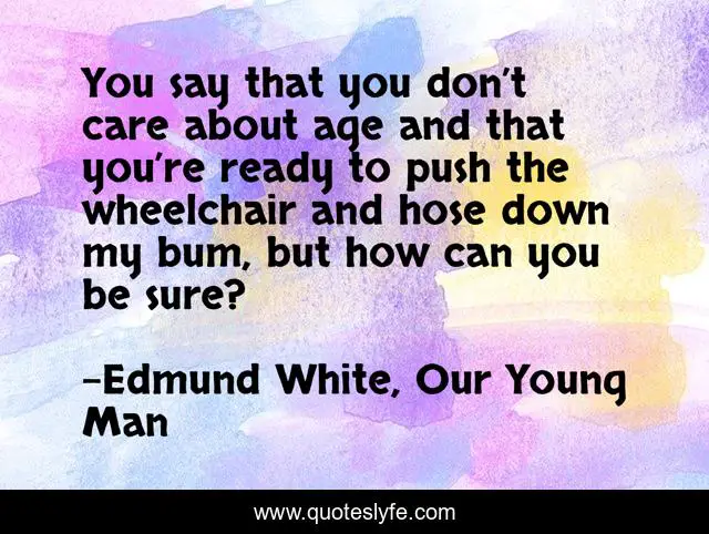 This page presents the quote "You say that you don’t care about age and that you’re ready to push the wheelchair and hose down my bum, but how can you be sure?". Author of this quote is Edmund White, Our Young Man. .