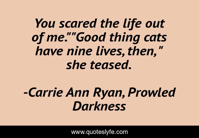This page presents the quote "You scared the life out of me.""Good thing cats have nine lives, then, " she teased.". Author of this quote is Carrie Ann Ryan, Prowled Darkness. This quote is about lion-shifter, series-finale, urban-fantasy-romance, phoenix, series-conclusion, paranormal-romance,.