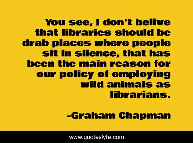 This page presents the quote "You see, I don't belive that libraries should be drab places where people sit in silence, that has been the main reason for our policy of employing wild animals as librarians.". Author of this quote is Graham Chapman. .