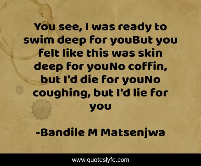 This page presents the quote "You see, I was ready to swim deep for youBut you felt like this was skin deep for youNo coffin, but I'd die for youNo coughing, but I'd lie for you". Author of this quote is Bandile M Matsenjwa. This quote is about setting-dawn-of-love, love, affection,.