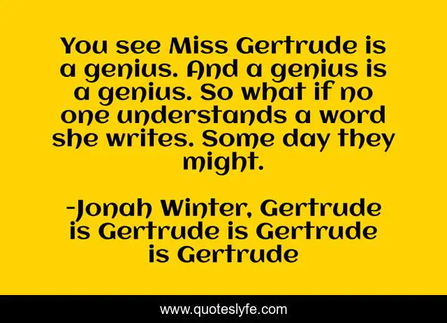 This page presents the quote "You see Miss Gertrude is a genius. And a genius is a genius. So what if no one understands a word she writes. Some day they might.". Author of this quote is Jonah Winter, Gertrude is Gertrude is Gertrude is Gertrude. .