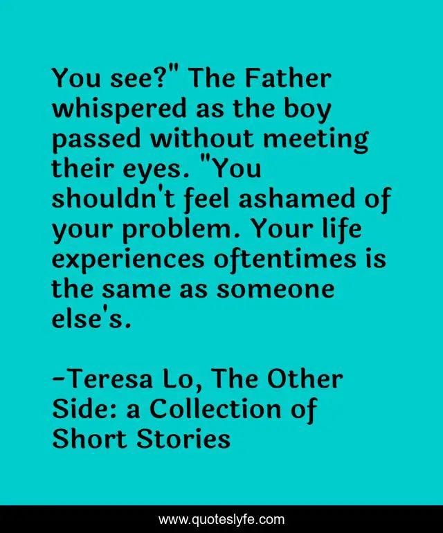 This page presents the quote "You see?" The Father whispered as the boy passed without meeting their eyes. "You shouldn't feel ashamed of your problem. Your life experiences oftentimes is the same as someone else's.". Author of this quote is Teresa Lo, The Other Side: a Collection of Short Stories. This quote is about daughter, life, father, inspirational, enthusiasm,.