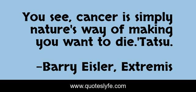 This page presents the quote "You see, cancer is simply nature's way of making you want to die.'Tatsu.". Author of this quote is Barry Eisler, Extremis. This quote is about irony, cancer, death-and-sickness, cynicism,.