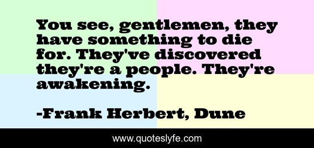 This page presents the quote "You see, gentlemen, they have something to die for. They've discovered they're a people. They're awakening.". Author of this quote is Frank Herbert, Dune. This quote is about awakening, revolution,.