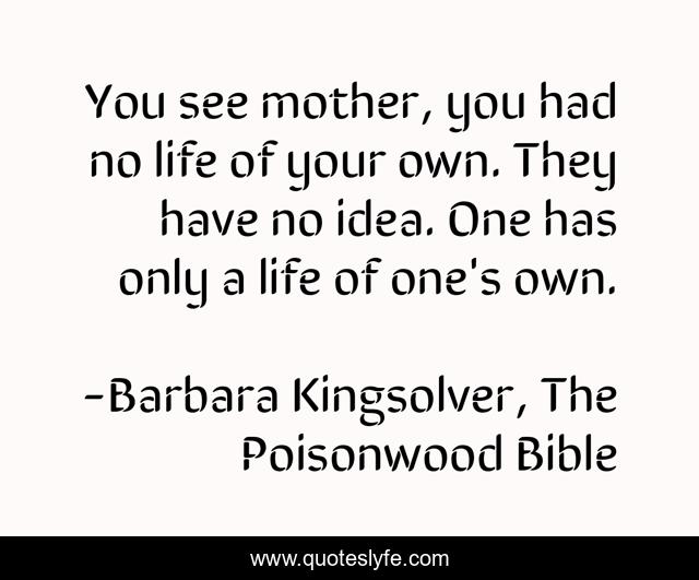 This page presents the quote "You see mother, you had no life of your own. They have no idea. One has only a life of one's own.". Author of this quote is Barbara Kingsolver, The Poisonwood Bible. .