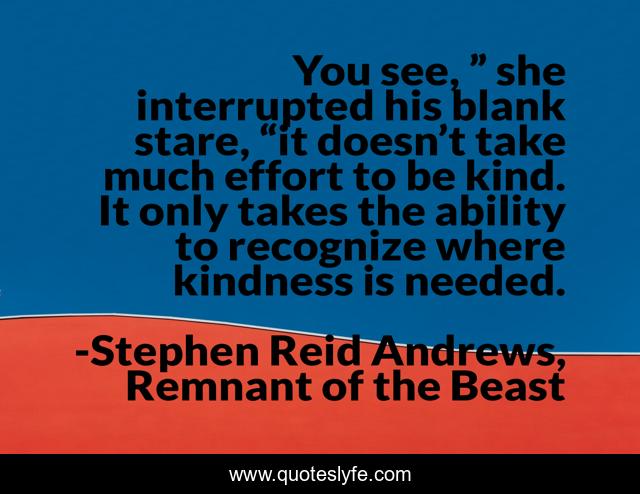 This page presents the quote "You see, ” she interrupted his blank stare, “it doesn’t take much effort to be kind. It only takes the ability to recognize where kindness is needed.". Author of this quote is Stephen Reid Andrews, Remnant of the Beast. This quote is about serving, kindness-compassion, inspirational, enthusiasm, kindness, charity,.