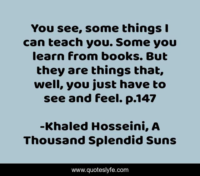 This page presents the quote "You see, some things I can teach you. Some you learn from books. But they are things that, well, you just have to see and feel. p.147". Author of this quote is Khaled Hosseini, A Thousand Splendid Suns. .