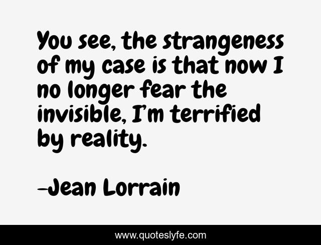 This page presents the quote "You see, the strangeness of my case is that now I no longer fear the invisible, I’m terrified by reality.". Author of this quote is Jean Lorrain. This quote is about invisible, fear, horror, reality,.