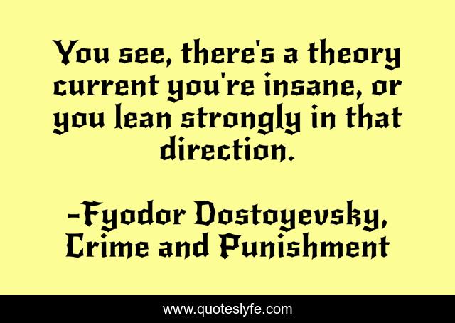 This page presents the quote "You see, there's a theory current you're insane, or you lean strongly in that direction.". Author of this quote is Fyodor Dostoyevsky, Crime and Punishment. .