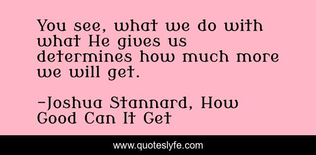 This page presents the quote "You see, what we do with what He gives us determines how much more we will get.". Author of this quote is Joshua Stannard, How Good Can It Get. This quote is about increase, god, growth, stewardship,.