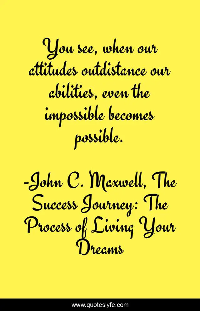 This page presents the quote "You see, when our attitudes outdistance our abilities, even the impossible becomes possible.". Author of this quote is John C. Maxwell, The Success Journey: The Process of Living Your Dreams. This quote is about behaviour, attitude,.
