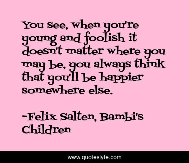 This page presents the quote "You see, when you're young and foolish it doesn't matter where you may be, you always think that you'll be happier somewhere else.". Author of this quote is Felix Salten, Bambi's Children. This quote is about restlessness, childhood, nostalgia,.