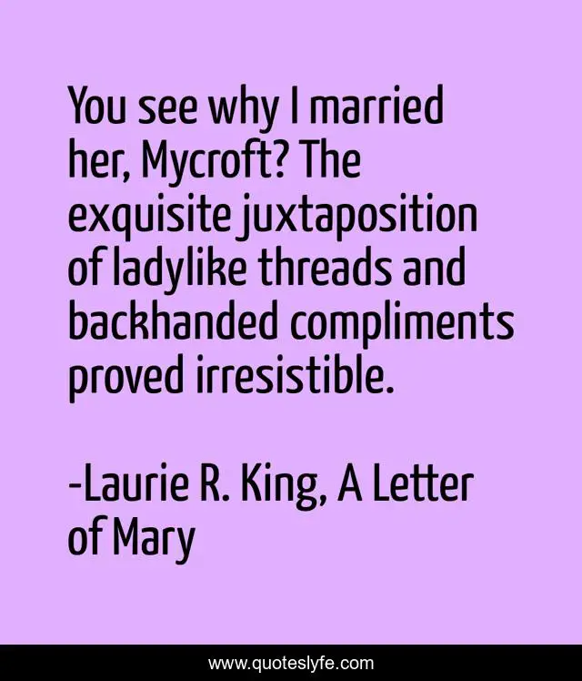 This page presents the quote "You see why I married her, Mycroft? The exquisite juxtaposition of ladylike threads and backhanded compliments proved irresistible.". Author of this quote is Laurie R. King, A Letter of Mary. This quote is about relationships, sarcasm, marriage,.