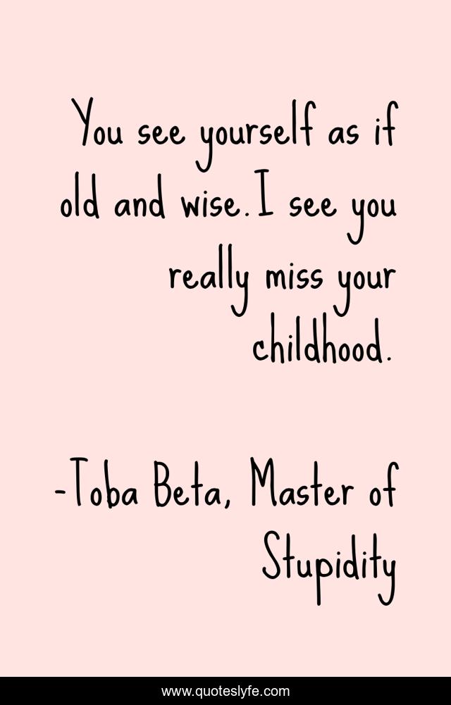 This page presents the quote "You see yourself as if old and wise.I see you really miss your childhood.". Author of this quote is Toba Beta, Master of Stupidity. This quote is about old, child,.