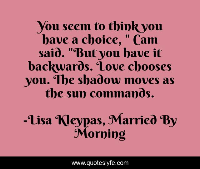 This page presents the quote "You seem to think you have a choice, " Cam said. "But you have it backwards. Love chooses you. The shadow moves as the sun commands.". Author of this quote is Lisa Kleypas, Married By Morning. This quote is about love, affection,.