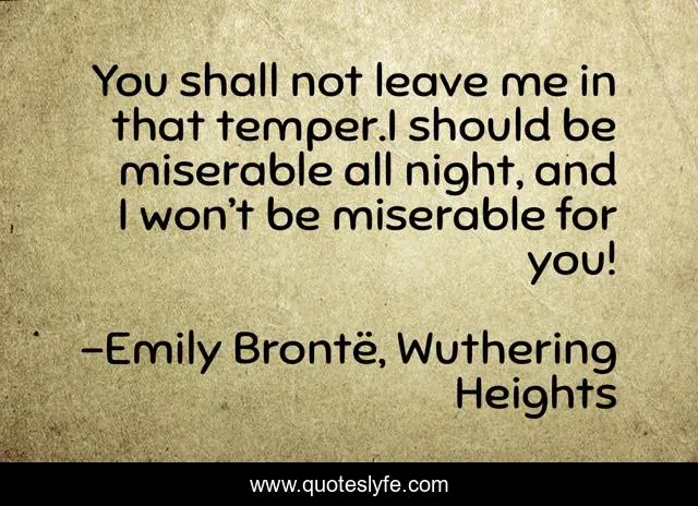 This page presents the quote "You shall not leave me in that temper.I should be miserable all night, and I won’t be miserable for you!". Author of this quote is Emily Brontë, Wuthering Heights. This quote is about edgar-linton, catherine-earnshaw, argument, misery,.