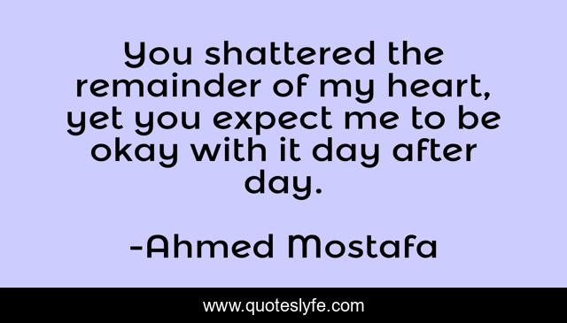 This page presents the quote "You shattered the remainder of my heart, yet you expect me to be okay with it day after day.". Author of this quote is Ahmed Mostafa. This quote is about broken-heart, shattered, lost-love, toleration, shattered-heart, broken-hearted, shattered-souls, fake-love, pretentiousness,.