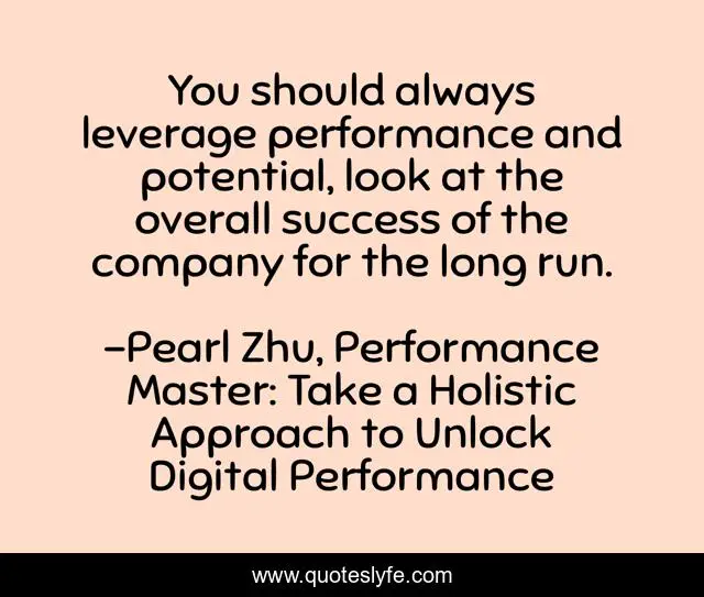 This page presents the quote "You should always leverage performance and potential, look at the overall success of the company for the long run.". Author of this quote is Pearl Zhu, Performance Master: Take a Holistic Approach to Unlock Digital Performance. This quote is about performance-management, potential,.