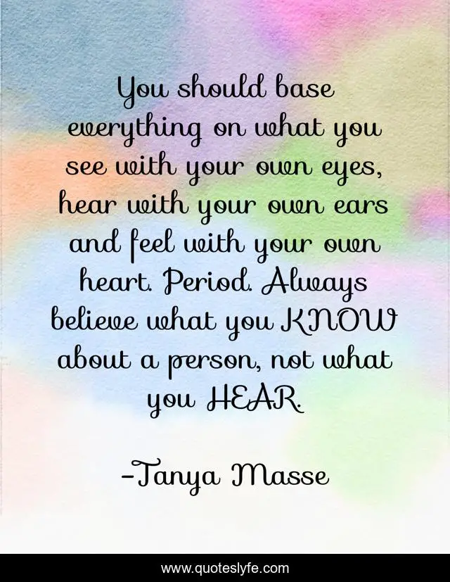 This page presents the quote "You should base everything on what you see with your own eyes, hear with your own ears and feel with your own heart. Period. Always believe what you KNOW about a person, not what you HEAR.". Author of this quote is Tanya Masse. This quote is about what-you-hear, quotes-to-live-by, life, comic-strip-mama, quotes-about-life,.