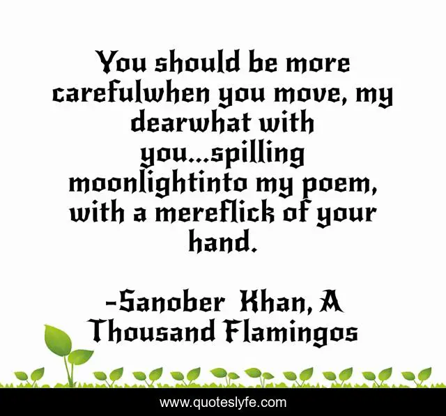 This page presents the quote "You should be more carefulwhen you move, my dearwhat with you...spilling moonlightinto my poem, with a mereflick of your hand.". Author of this quote is Sanober Khan, A Thousand Flamingos. This quote is about spill, free-verse, poetry-love, poetry, muse, moon, moonlight, poetic, ink,.