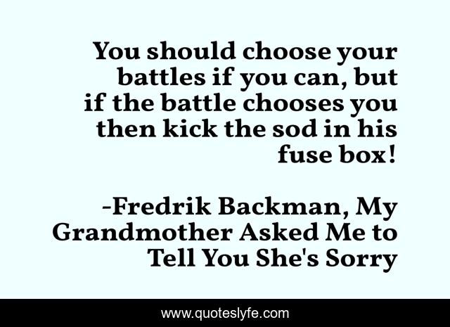 This page presents the quote "You should choose your battles if you can, but if the battle chooses you then kick the sod in his fuse box!". Author of this quote is Fredrik Backman, My Grandmother Asked Me to Tell You She's Sorry. This quote is about advice, fuse-box, choose-wisely, pick-your-battles, granny,.