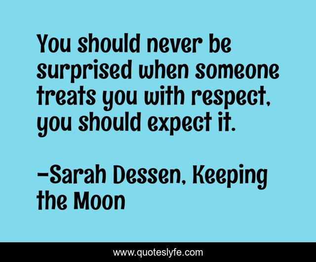 This page presents the quote "You should never be surprised when someone treats you with respect, you should expect it.". Author of this quote is Sarah Dessen, Keeping the Moon. This quote is about enthusiasm, inspirational,.