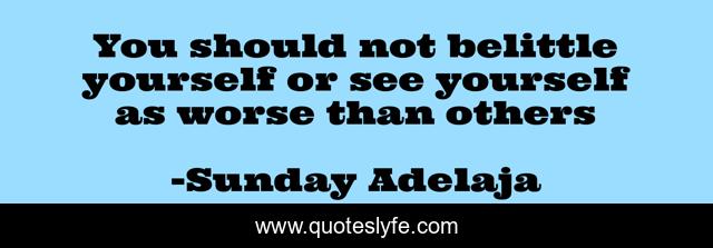 This page presents the quote "You should not belittle yourself or see yourself as worse than others". Author of this quote is Sunday Adelaja. This quote is about fulfillment, belittle, purpose, worse, calling,.