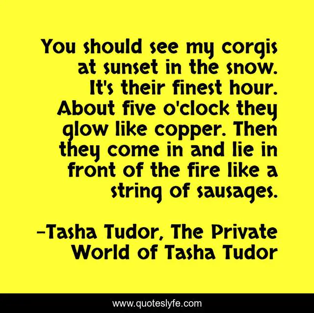 This page presents the quote "You should see my corgis at sunset in the snow. It's their finest hour. About five o'clock they glow like copper. Then they come in and lie in front of the fire like a string of sausages.". Author of this quote is Tasha Tudor, The Private World of Tasha Tudor. This quote is about corgis, winter, snow, dogs,.