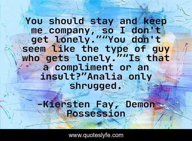 This page presents the quote "You should stay and keep me company, so I don't get lonely.”“You don't seem like the type of guy who gets lonely.”“Is that a compliment or an insult?”Analia only shrugged.". Author of this quote is Kiersten Fay, Demon Possession. This quote is about funny, science-fiction, romance, shadow-quest, comedy, paranormal-romance,.