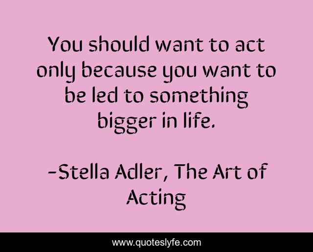 This page presents the quote "You should want to act only because you want to be led to something bigger in life.". Author of this quote is Stella Adler, The Art of Acting. This quote is about acting, life-and-living,.